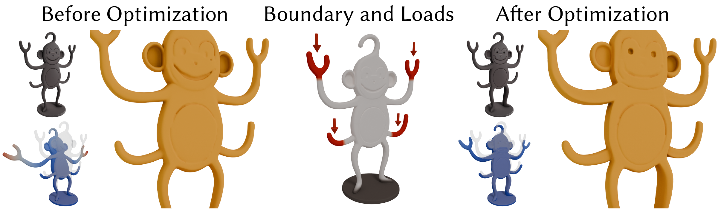 Our method fully leverages the flexibility of the finite element method (FEM) by allowing users to define custom boundary conditions (black) and apply loads to specific regions (red with arrows). This enables adaptation to a wide range of real-world scenarios.