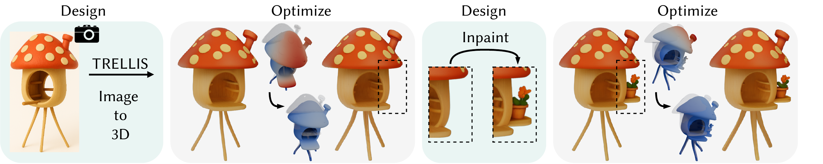 By operating directly in the latent space of a generative model, PhysiOpt retains its full capabilities and enables multi-step design phases without cumbersome and “lossy” conversions between representations. For example, with TRELLIS, users can start by generating a shape from an input image, optimize it under specific loads (e.g., an additional load on the front porch), modify the geometry via inpainting (e.g., by adding a side platform with a flowerpot), and then re-optimize the updated shape to account for the new geometry.