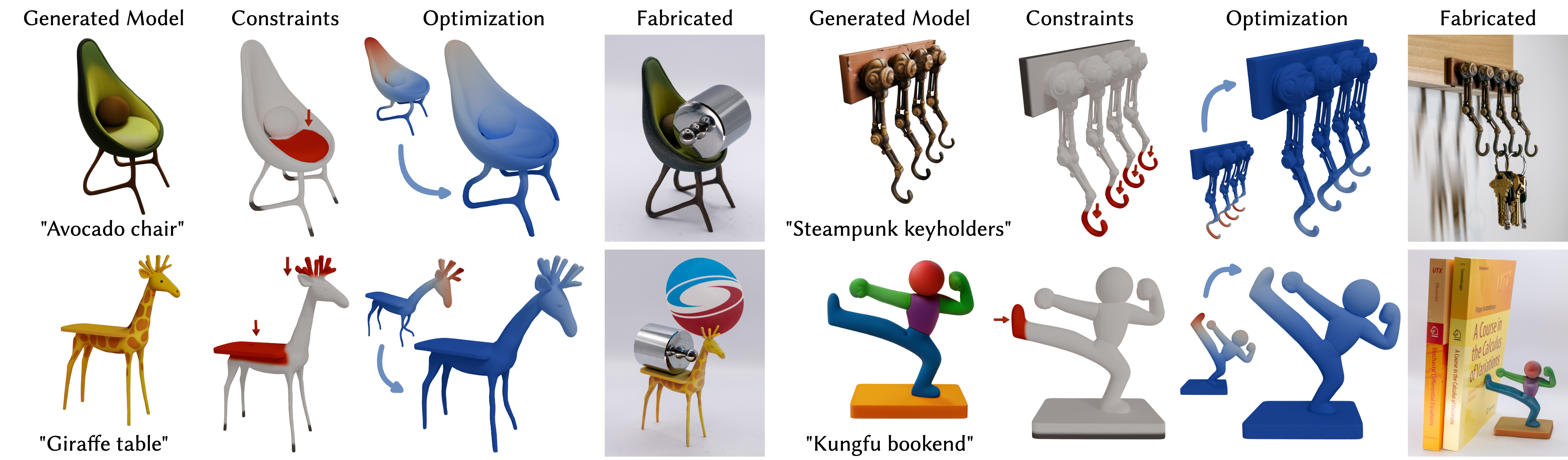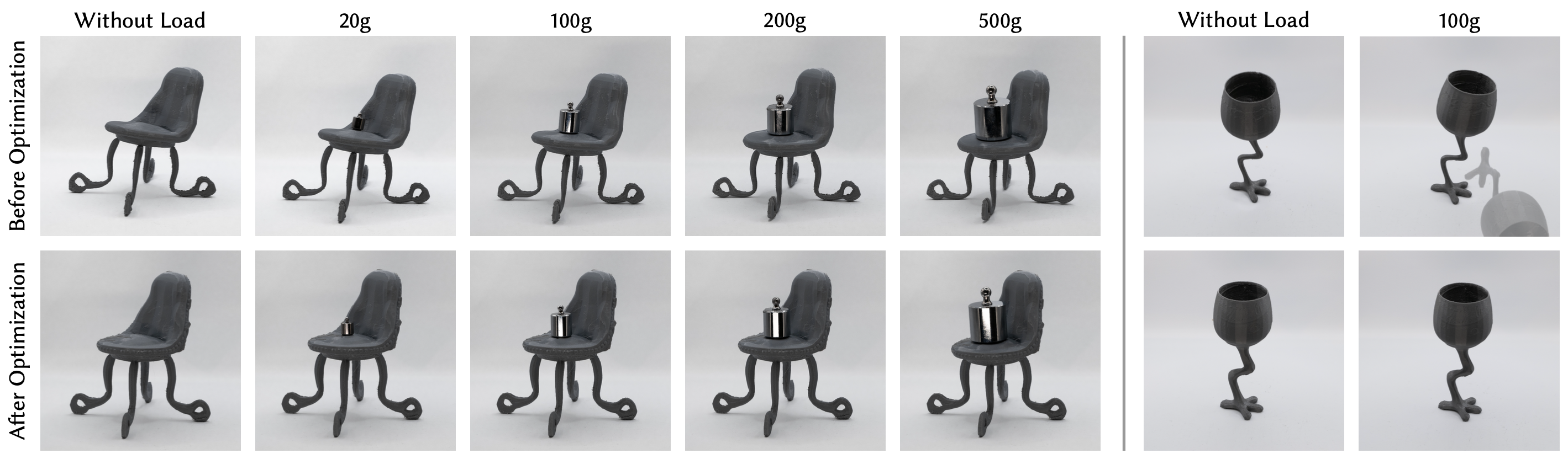 We demonstrate the effectiveness of our optimizer by fabricating various shapes before and after optimization. In this example, the unoptimized octopus chair (left) deforms and its legs touch the ground, while the unoptimized flamingo glass (right) tips over with minimal weight.