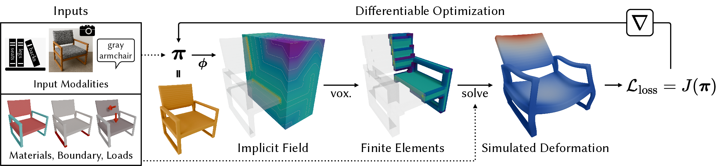 Our approach supports a variety of input modalities (Inputs, left), including libraries of shapes and parts, images, and text prompts, which are converted into the latent parameters of a given generative model. Users can also specify materials, loads, and boundary conditions. Given a latent parameter $\boldsymbol{\pi}$, PhysiOpt decodes it into an implicit field $\phi(\cdot, \boldsymbol{\pi})$, which is voxelized to produce a sparse set of density-weighted finite elements. Under the user-defined conditions, we solve for displacements using linear static analysis and compute a physics-based loss $J(\boldsymbol{\pi})$. The entire process is fully differentiable, allowing iterative updates of $\boldsymbol{\pi}$ towards more physically compliant designs (Differentiable Optimization, right).