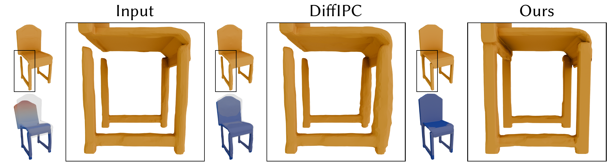 Constrary to traditional mesh-based shape optimization methods (e.g., DiffIPC), PhysiOpt enables semantically consistent changes to geometry rather than vertex perturbations. Operating in the latent space of generative models also leads to faster convergence.